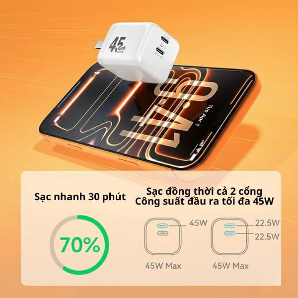 Sạc Nhanh Kép 45W – Rút Ngắn Thời Gian Chờ Đợi