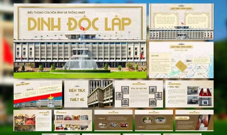 Dinh Độc Lập là một trong những biểu tượng lịch sử quan trọng gắn liền với ngày 30/4/1975, vì vậy các mẫu PowerPoint 30/4 1/5 theo chủ đề này luôn mang tính trang trọng và giàu ý nghĩa. Thiết kế thường sử dụng hình ảnh Dinh Độc Lập, xe tăng tiến vào cổng, cùng các chi tiết mang dấu ấn lịch sử để tái hiện khoảnh khắc thống nhất đất nước. Màu sắc chủ đạo thường là đỏ, vàng kết hợp với bố cục rõ ràng, giúp làm nổi bật nội dung chính.